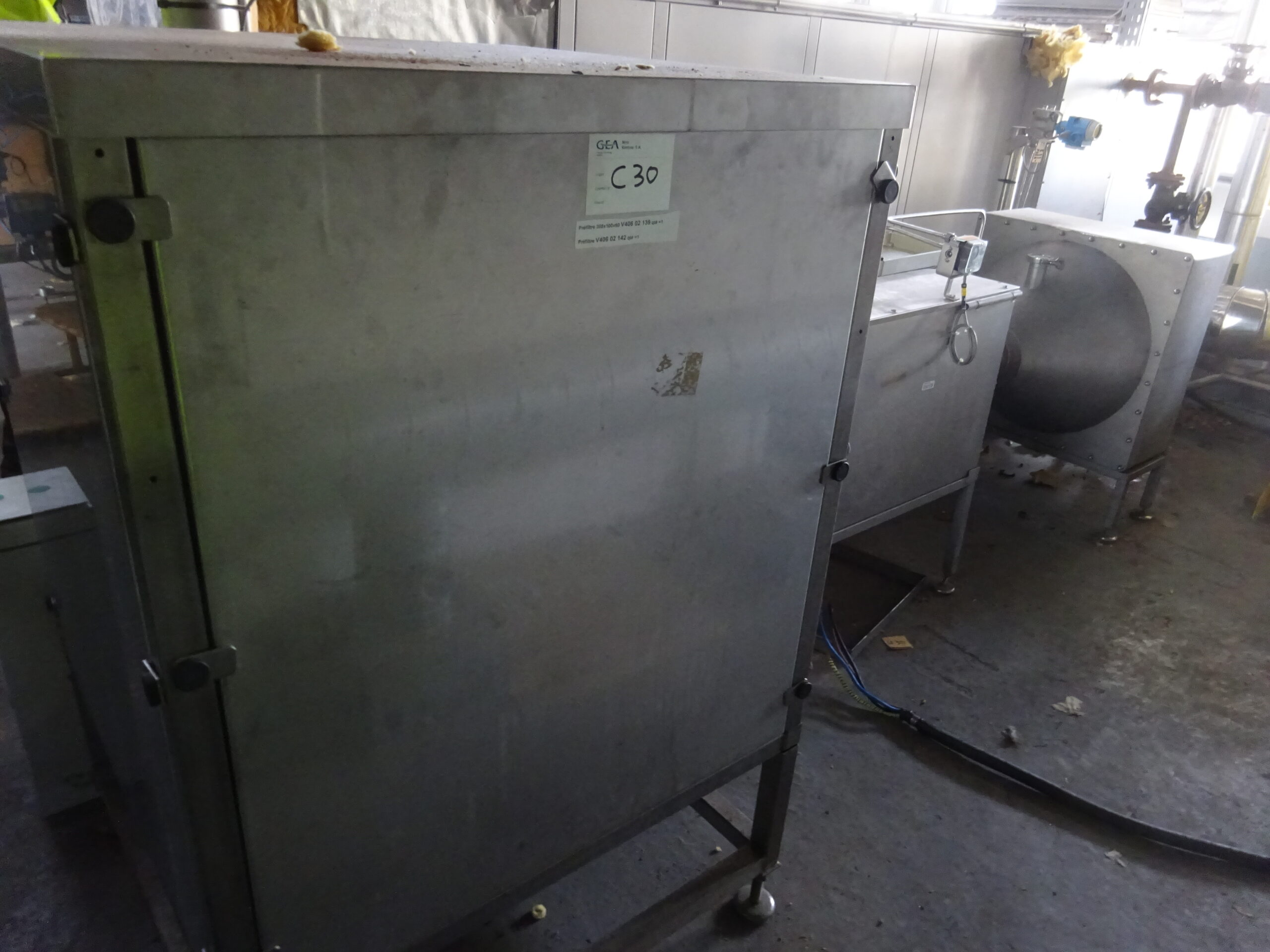 Spray dryer GEA NIRO P 6.3 Atomiseur rotatif type FS1 (30 000 tr/min max) Chambre de séchage diamètre 1600 mm, hauteur 800 mm, cône 60° Capacité évaporative : 10-60 kg/h Taille moyenne des particules : 10 à 100 µm Année de fabrication 2000, mais utilisé que quelques années Parties en contact avec le produit AISI 316 2 turbines (1 neuve et 1 remise à neuf) Non ATEX Conclusion de l'audit mécanique réalisé en 2024 par GEA : "L’état général actuel est excellent. Seul l’automate, déjà identifié endommagé en 2017 nécessite vraiment d’être remplacé." (rapport envoyé sur demande) Ligne soufflage air chaud inclue Ligne extraction de l'air vers l'extérieur inclue Container, cage et roule fût inclus PID et dossier disponibles sur demande