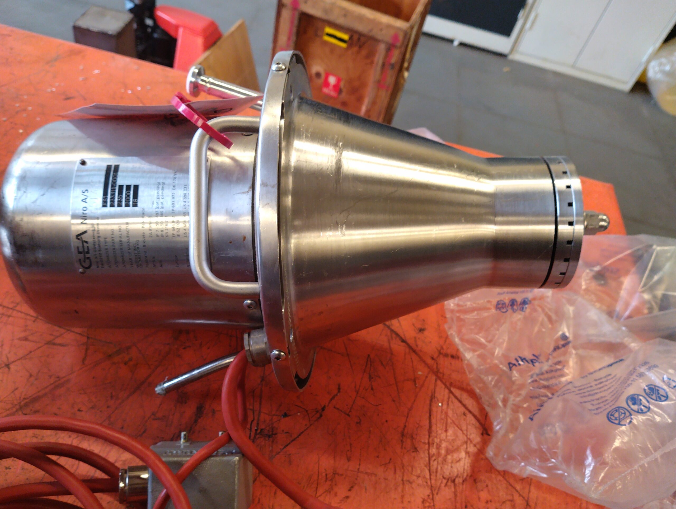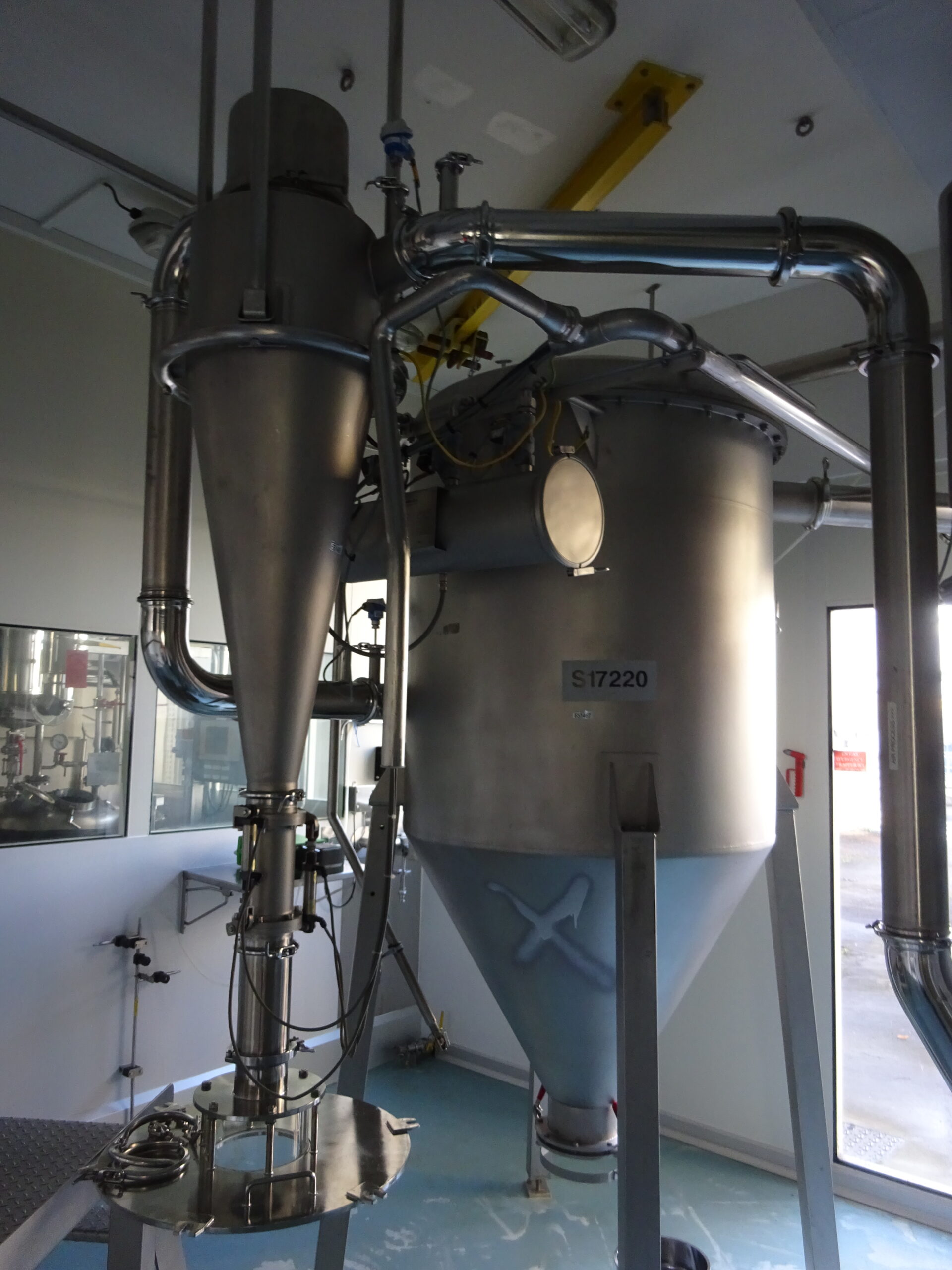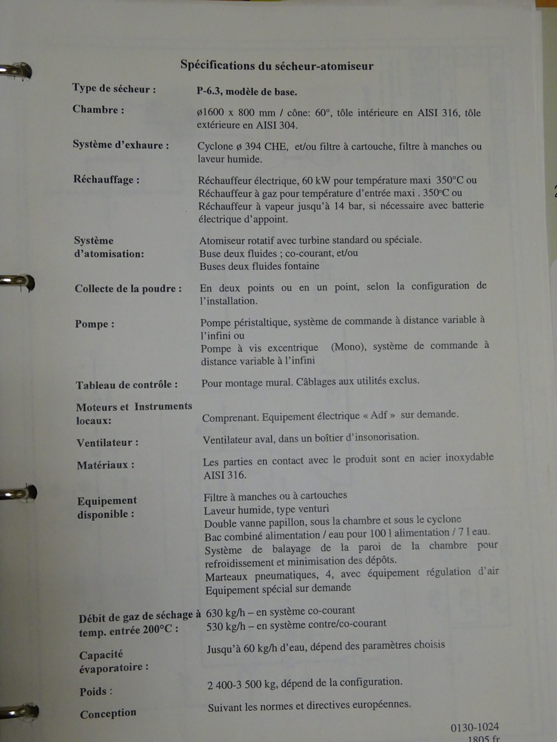 Spray dryer GEA NIRO P 6.3 Atomiseur rotatif type FS1 (30 000 tr/min max) Chambre de séchage diamètre 1600 mm, hauteur 800 mm, cône 60° Capacité évaporative : 10-60 kg/h Taille moyenne des particules : 10 à 100 µm Année de fabrication 2000, mais utilisé que quelques années Parties en contact avec le produit AISI 316 2 turbines (1 neuve et 1 remise à neuf) Non ATEX Conclusion de l'audit mécanique réalisé en 2024 par GEA : "L’état général actuel est excellent. Seul l’automate, déjà identifié endommagé en 2017 nécessite vraiment d’être remplacé." (rapport envoyé sur demande)